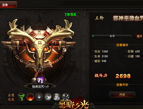 在17aiwan黑暗之光中到玩家角色到达60多级做完主线任务就会开启巫像这一系统。这一系统可以提升战力和属性,玩家在激活巫像系统之后,就可以直接获得战力和攻击、防御、生命、破防、闪避五大属性提升,喂养巫像魂石(类似骑兽资质丹)可额外提升巫像属性,并通过巫像升阶不断提升喂养上限。