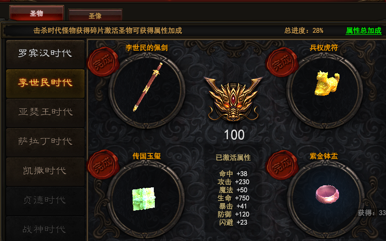 1. 圣物系统中共分为6个时代,分别是罗宾汉时代、李世民时代、亚瑟王时代、萨拉丁时代、凯撒时代、贞德时代,每个时代的圣物都有四个。
