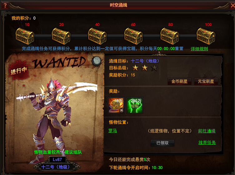 2、完成通缉可获得积分,积分累积可领取额外宝箱奖励;