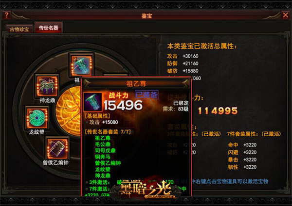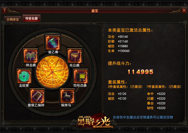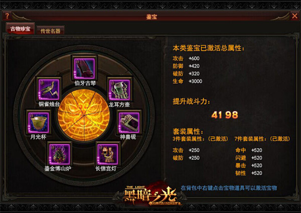 首先当我们到达83级之后就会开启这一系统。并分别进入“古物珍宝”和“传世名器”两个页签,每个页签中都包含七样宝物,每样宝物都相当于一件罕见装备。获得宝物后可分别为角色增加攻击、生命、防御、破防几大属性加成并提升战力,更有额外套装属性可激活。套装属性分为3件套装属性和7件套装属性两种,额外提升命中、闪避、暴击、韧性几大属性。