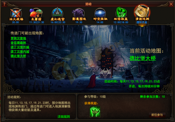 黑暗之光清剿地渊玩法在每天的11:00、13:00、15:00、17:00、19:00、21:00、23:00这几个时间段循环开启,每次持续30分钟。玩家角色等级需达到10级方可参与该活动,每天可参加10次。