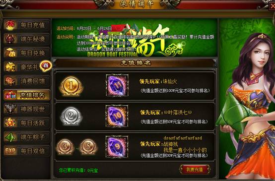 【活动说明】:活动期间,本服累计充值排名前5名便可获得丰厚奖励!排名第1更可获得11级黑水晶的奖励!累积充值300000元宝即可参与排名!活动结束后,奖励通过邮件发放!