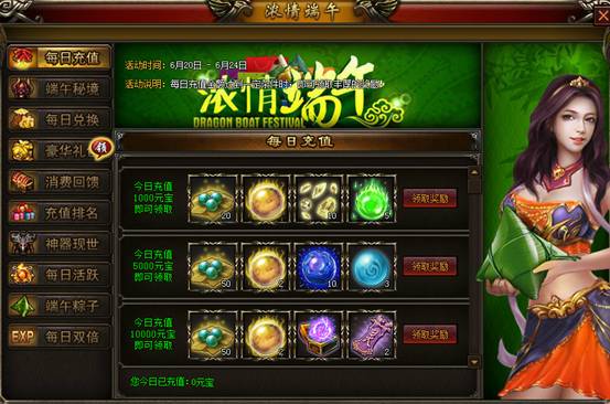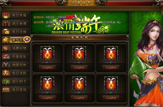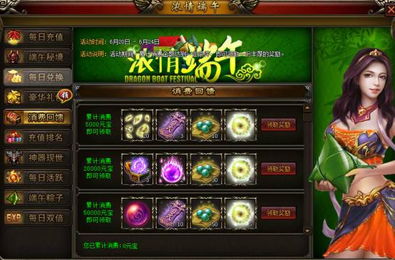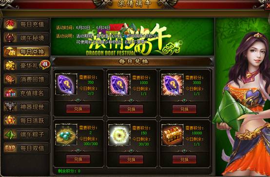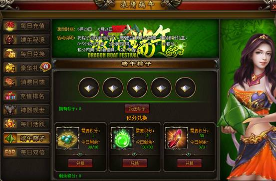 【活动说明】:将粽子投送到汨罗江,屈原的英灵将会回馈一定的积分礼盒,0-5个积分礼盒,分别可获得1、2、3、5、10、20积分!积分可用于兑换道具,积分不清0。