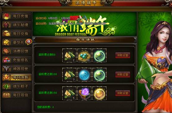【活动说明】:当活跃度达到50、100、150后,可获得对应的奖励!