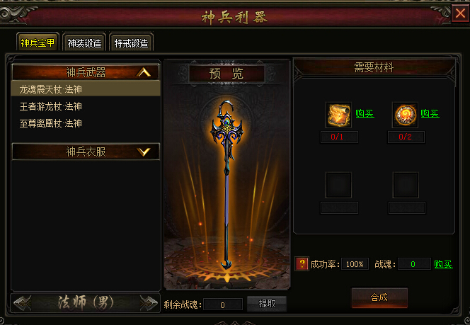 在进入游戏后,点击右上角的神兵利器可以进入神兵神甲的合成界面,主要分为神兵宝甲、神装锻造以及特戒锻造三个方面。神兵宝甲中是合成武器与衣服,而神装锻造中是负责合成头盔、项链、护腕、戒指、腰带以及靴子,最后的特戒锻造是在护体戒指、麻痹戒指等特殊戒指的基础上进行戒指的升级。