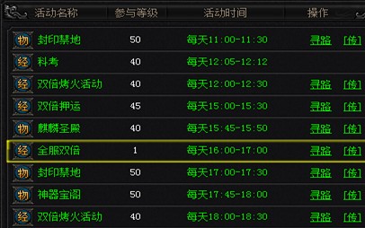 每天全服双倍时间:16:00---17:00,双倍时间,这一个小时是挂机升级的好时机。使用一个双倍经验符,配合双倍时间段,那经验可是倍速增长。