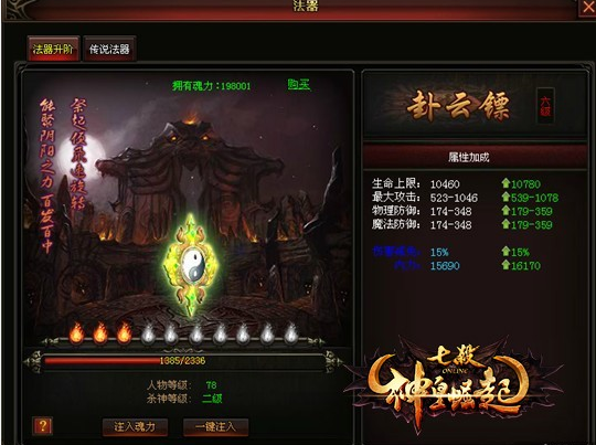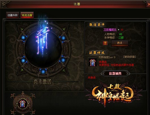 传说法器需要使用万妖幡碎片来激活,而且需要杀神等级。每一等级的法器都有不同的强大技能。万妖幡碎片可通过击杀深渊迷宫的BOSS获得!强大的属性加成,让你欲罢不能!(传说法器与法器属性叠加)