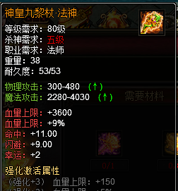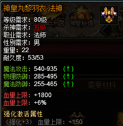 神皇九黎杖的加35514战力,神皇九黎杖是由末日赤魂加上8个神兵谱和5000点战魂合成。神皇九黎羽衣战力加成是11717,神皇九黎羽衣是由末日赤魂羽衣加上8个神兵谱和2000点战魂合成。