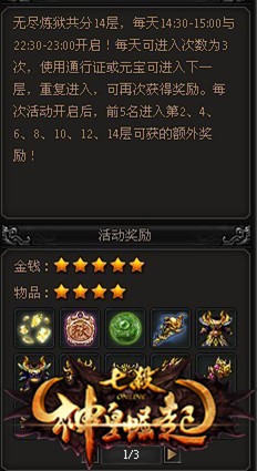 无尽炼狱活动共分14层,每天14:30-15:00与22:30-23:00开启!每天可以进入3次。使用通行证或元宝进入下一层,前五名进入双数层的玩家可获得额外奖励!