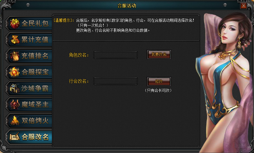 2、 合服后重名玩家可在合服活动面板中进入合服改名系统修改角色名