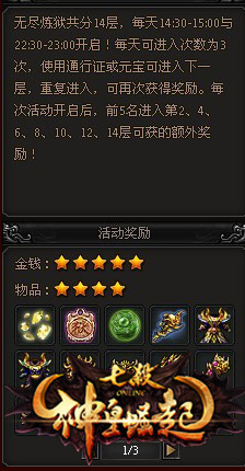 无尽炼狱活动共分14层,每天14:30-15:00与22:30-23:00开启!每天可以进入3次。使用通行证或元宝进入下一层,前五名进入双数层的玩家可获得额外奖励!