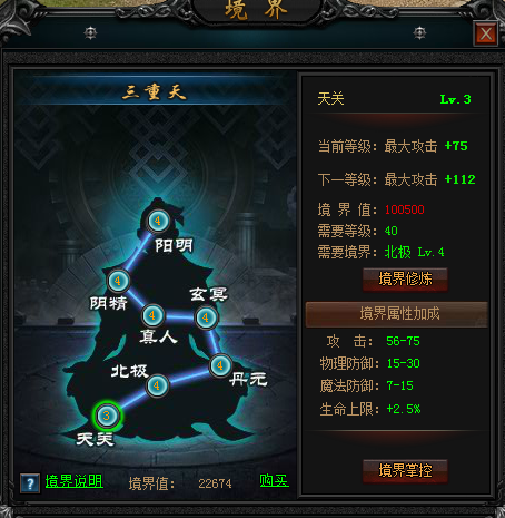 境界可以通过“境界任务”提升,还可以通过绑元购买“境界丹(小)”提高,每天可以买5个,一共提升5万点。