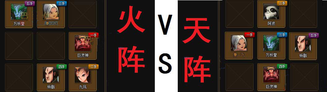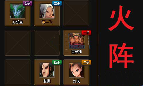 如图所示,火阵是大家最常用的阵法之一,主要由于中路既是先手,又是可以随便放弃的位置,无论是放置先手“控制”还是先手“肉盾”都是很理想的位置,而上下两路前“肉盾”后“输出”几乎毫无破绽