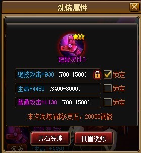 7、灵石批量洗练,不锁定需要30个灵石,锁定一项60个灵石,锁定2项90灵石,另外需若干铜板