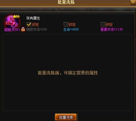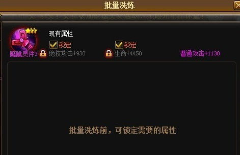 2、使用批量洗练,一次能洗出10条属性(每条包含三项属性),这样你能从10条属性项目当中自由选择一项你最满意的。封灵如果一次一次地洗很容易遇到洗了几次还不如前几天的属性,这就太憋屈了(这就相当于吃了后悔药,可以选择洗过的属性)。
