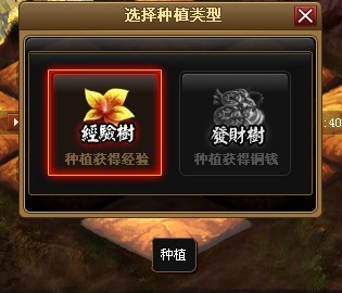 玩家通过在药园种植经验树和发财树可以获得额外的经验和铜钱,玩家在44级主线任务后可以种植发财树。经验树经验超过