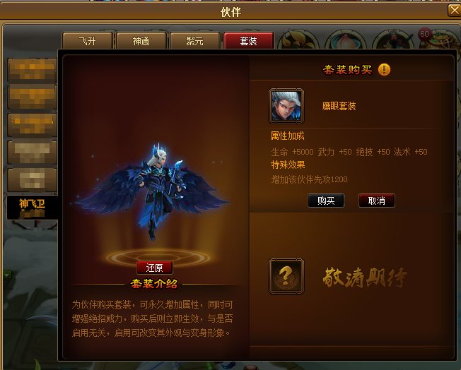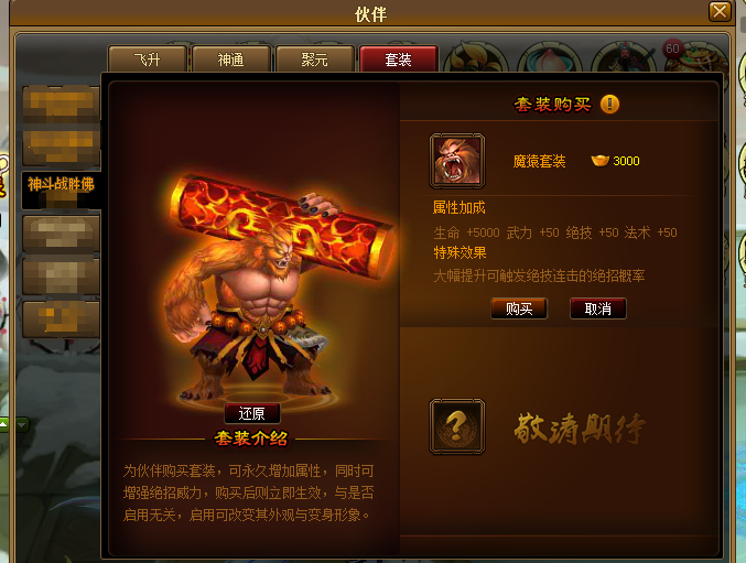 装伙伴的生命+5000 武力绝技法术各+50 而且还有着自己的特殊效果哦 ~