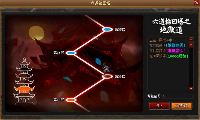 每个关卡分别有25层,每一层都有一个小BOSS带领几只小怪,只有击败他们才能进入下一层,到达该关卡的25层并胜利通过后即可打开下一个关卡。不能越层和越关卡挑战。击败每一层的怪物后可以获得大量的经验、武魂和灵件。而灵件又分蓝色和紫色。蓝色灵件在每一层都有几率掉落,而紫色灵件只能在第5、10、15、20、25层才会有几率掉落。