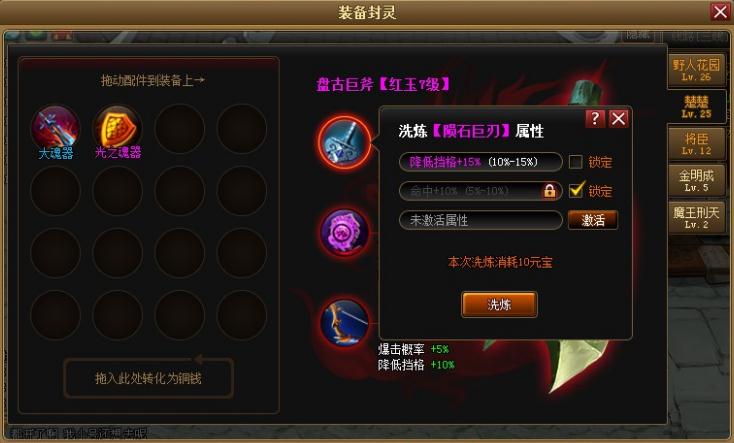 封灵初始状态只有一种属性,分别有绿色、蓝色、紫色、金色和红色,可以消耗灵石和铜钱对属性进行洗练。而灵件的另外两条属性都可以花费元宝进行激活,拥有三条属性的灵件自然会比一条属性的更加强大。