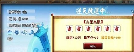 境界经验可以在吉星高照中通过扔骰子获得,但是注意的是扔出3吉星以上的才可以获得境界经验,不过如果扔出0-2吉星,也可以通过改运改到三吉星以上哦!!