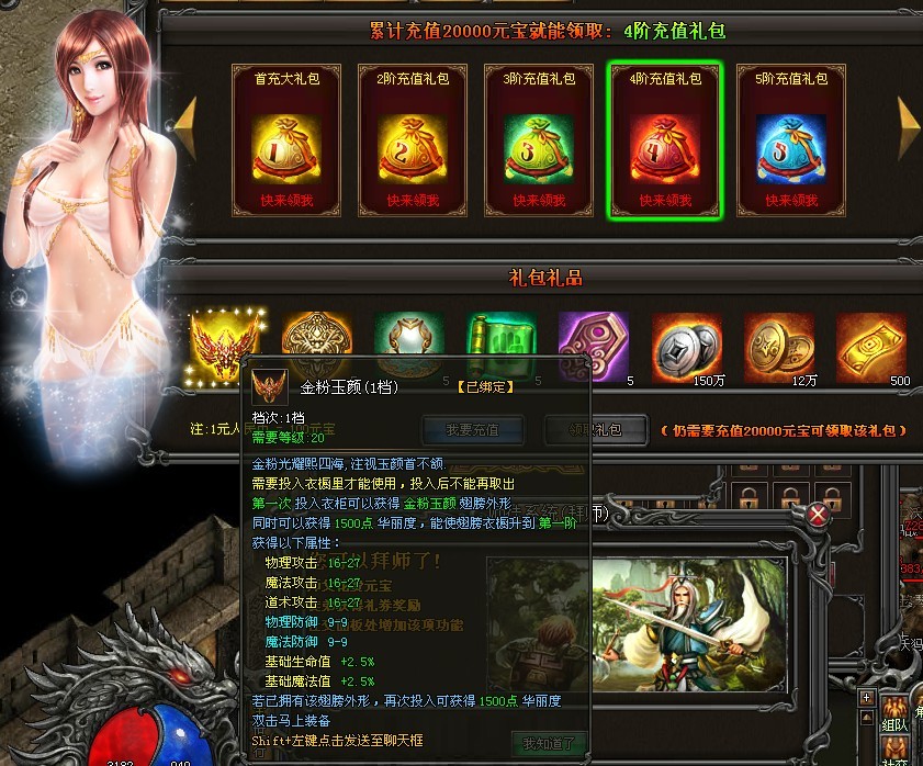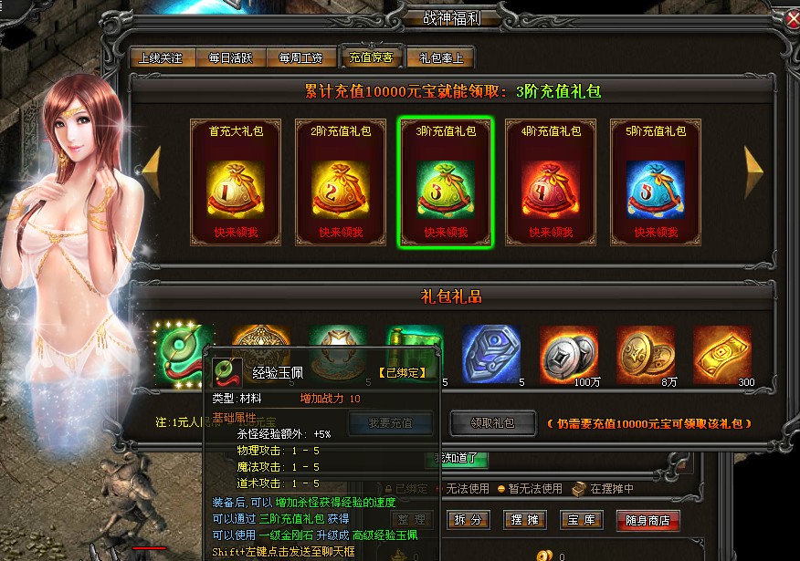 1.充值2阶礼包 获得经验玉佩,升级玉佩可以增加杀怪经验,升级利器,最高可加成 30%的经验!