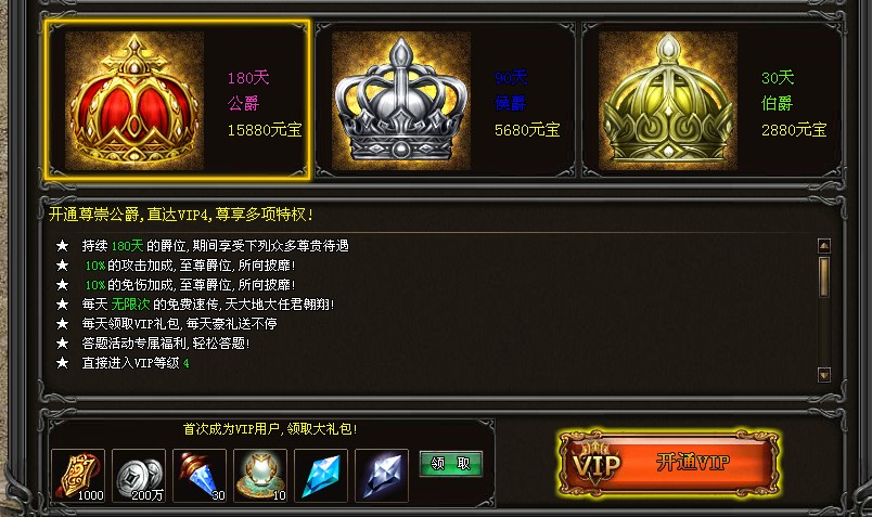 买一个vip爵位,直接到VIP4等级,VIP副本可以获得升华结晶,完美武器指 日可待!而且爵位和VIP的加成属性,妈妈再也不担心我的打怪被欺负了!(拜师之 后,师傅消费徒弟会有礼券收到,所以先拜师了再买爵位)。