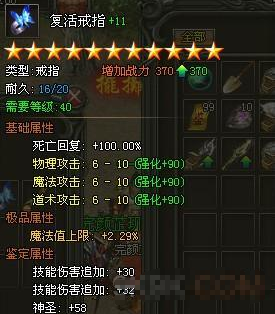 不过相同属性的装备只能在身上装备一件。复活戒指主要起到的是一个能为主角瞬间复活的回春效果,不过即使这样,戒指依然可以给主角带来不错的属性加成。首先戒指有自身的基础属性,物理、魔法和道术都是加3-6,鉴定后的属性可以追加伤害45,防御提高能够提高42。