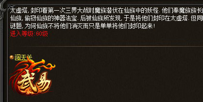 《武易》中玩家想要追求极致挑战,可以进入太虚天关副本。天关一共有30层,每层都有一个怪物,随着层数的上升