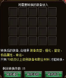 不过转换职业之后可以对装备进行一定的转化,70级以上的装备以及职业材料是可以转化的,转化会继承装备类型、强化、鉴定、极品属性、幸运。