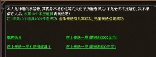 在进入第九层的时候相应那些怪是比较难打的,怪也是比较少,所以在这个时候才开始使用使用元宝进入传送,然后使用元宝传送也不用直接达到12层,如果在11层的时候是自己一个人在刷,那就不用传了,在11层刷出道具,刷够后就可以马上进入12层的。