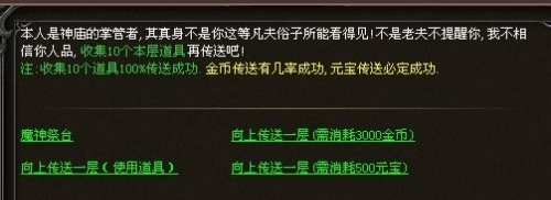 在进入第九层的时候相应那些怪是比较难打的,怪也是比较少,所以在这个时候才开始使用使用元宝进入传送,然后使用元宝传送也不用直接达到12层,如果在11层的时候是自己一个人在刷,那就不用传了,在11层刷出道具,刷够后就可以马上进入12层的。