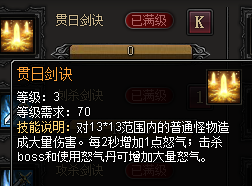 贯日剑诀需要杀神二级自动获得,随着杀神等级的提升贯日剑诀也会提升。怒气达到100时才可以使用贯日剑诀。