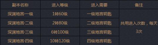深渊地宫是武易中的一个系列副本,玩家通过武城NPC慕容宫主处打开副本界面,该副本中共有四个等级地宫,每个地宫需要对应等级和对应等级的地宫钥匙才可以进入,每天可进入3次,进入任何一个地宫都会消耗进入次数。详情如下表: