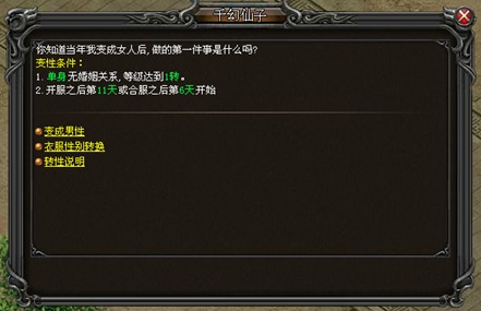 当然变性也是有一些要求的,玩家在游戏中是单身无婚姻关系,等级达到1转,并且在开服之后11天或合服后第6天后可进行变性。具体的变性方法是在比骑城找千幻仙子,玩家找到这个NPC之后就可以变性了,在打开之后会提示“想要变为女性?”这样的字眼。变性需要消耗一个阴阳造化丹,变形后仅性别以及外观转变,装备一切属性保持不变。对于有要求装备性别的衣服和时装,只有70级及以上的衣服才可转换,屠龙宝甲和狂屠龙宝甲也可转换,限时时装不能转换。