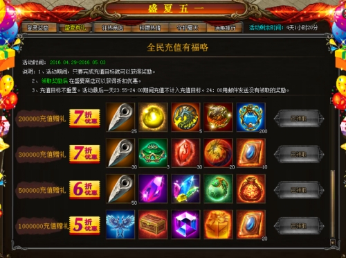 b、盛夏有礼。全民充值有福咯。领取奖励后在盛夏商店可获得超值折扣奖励。要先领取奖励哟。