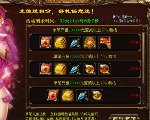 活动详情:活动期间充值送积分,单笔充值达到一定数额可激活奖励,消耗充值积分可领取对应大奖,奖励可通过充值反复获得哦!