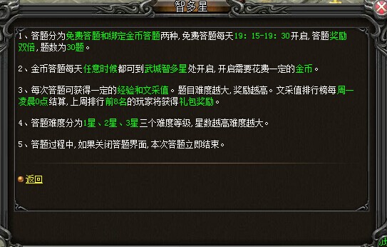 大家可以在比骑城中的答题管理者智多星那儿查询到每周的答题排行榜,还可以在非答题活动时间开启金币答题,赢得额外的经验和文采值。