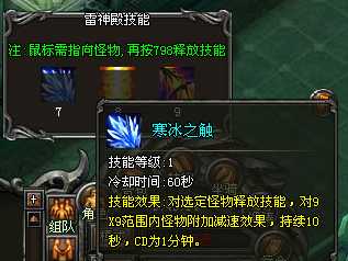 除了雷神塔以外,玩家还有三个额外技能可以使用,来帮助自己守住雷神水晶,快捷键分别是7、8、9。三个技能分别是:“寒冰之触”,作用是对范围内的怪物产生减速效果、“天怒雷光”,作用是使范围内敌人减少50%血量、“禁锢天雷”,作用是使范围内的敌人产生5秒的麻痹状态。这些技能都非常的实用和有效,但当然他们的cd也都比较长,如何挑选合适的时间使用这些技能就需要你自己去摸索掌握了。