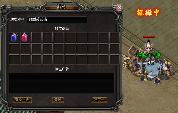 摆摊成功后,系统默认的摊位名字是“某某的小摊”,而想要留住其他玩家的目光就需要发挥你的无线创意,设计更有吸引力的店名和宣传语了。摆摊成功后,除了聊天及休闲游戏外,不能进行其他操作。 当然还可以在世界上发广告,让更多玩家知道你的物品。