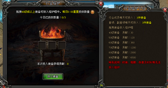 行会熔炉:可放入40级以上的装备进行熔炼,换取贡献值。行会熔炉不能升级。