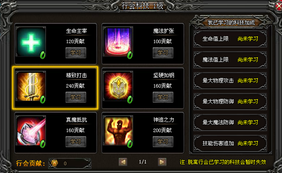 行会科技:可以使用贡献值学习行会技能,获得各种属性加成。科技建筑升级后,技能等级最高上限提升。