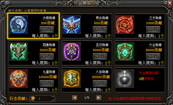 行会商店:可以使用贡献值购买商品,建筑等级越高,可以购买的商品种类越多。