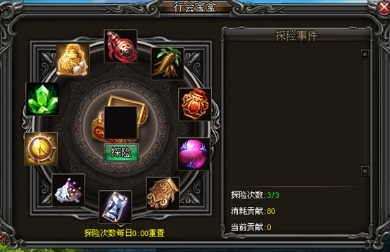 行会宝箱:可以使用贡献值进行探险抽奖,宝箱等级越高,每天可探险次数越多。