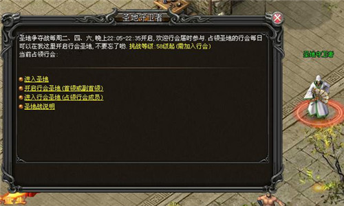 最终成功占领行会圣地的行会每天可在圣地守卫者处开启一次行会圣地,开启需由行会会长或副会长执行,开启时间为每天的10点至23点之间。该行会的成员可以进入其中杀怪获取行会贡献和经验。