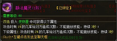 1阶的静法魔灵放入灵物宝匣后,有1%的几率给对方保持沉默,不能释放技能,持续3S。完美的法师克星,对道士也具有非常大的威胁,战士也会受此影响。而长达3秒的沉默时间,绝对是今后PK、攻城、抢BOSS的利器。不过这1%的概率不是很给力啊,不过提升一阶会增加1%的概率。