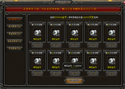 第三种,系统工资。首先是在线时长。每在线1小时都有数额不等的绑金领取,开区时间越久领取越多,另外还有签到和每周工资。另外,完成系统活跃度也有金币领取,活跃度一级可以获得10万绑金,二级奖励可以获取15万绑金,三级活跃可以获取30万绑金和8千金币,四级活跃度可以获得50万绑金和2万金币,每天固定的105万绑金还是很不错的。系统的投资计划可以买50万金币的投资计划,总共能领取1400万绑定金币。金砖投资计划为投资3888元宝,能领取69万金币,是否值得购买要看需求。