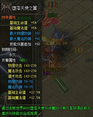玩家通过击败世界boss堕落天使与诛魔boss有几率获得碎片,集齐50块碎片就可以合成堕落天使之翼。