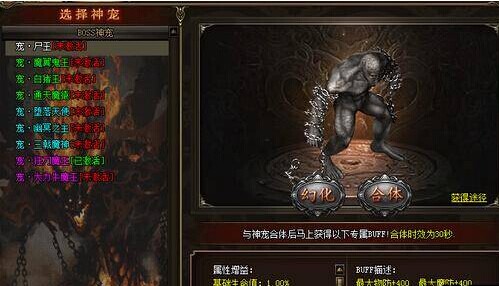 跟宠在幻化的情况下,已获得该神宠的玩家,可以选择合体,点击“合体”后,跟随的跟宠回收,玩家角色本身变身为神宠外形,可攻击。在神宠合体的同时,玩家能开启对应神宠的专属时效BUFF。合体的时限为30秒,30秒后,已获得的神宠全体有10分钟的冷却时间。